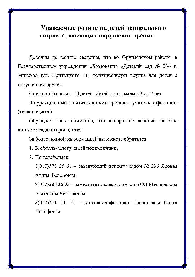 • Уважаемые родители, детей дошкольного возраста, имеющих нарушения зрения.