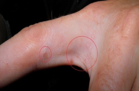 Клиника в начальной стадии – зуд, усиливающийся к вечеру и ночью, появление парных узелково-пузырных высыпаний на сгибательных поверхностях предплечий, кистях, подколенных впадин, ягодицах или бедрах.